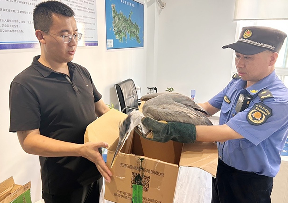 执法队员立即实施现场救助,并联系衢山自然规划中心所工作人员进行初步鉴定。经确认,该鸟为国家二级保护动物苍鹭。为避免其受到二次伤害,队员们小心将其转移至办公室,进行基础护理与伤口初步处理。