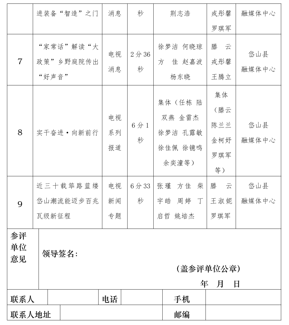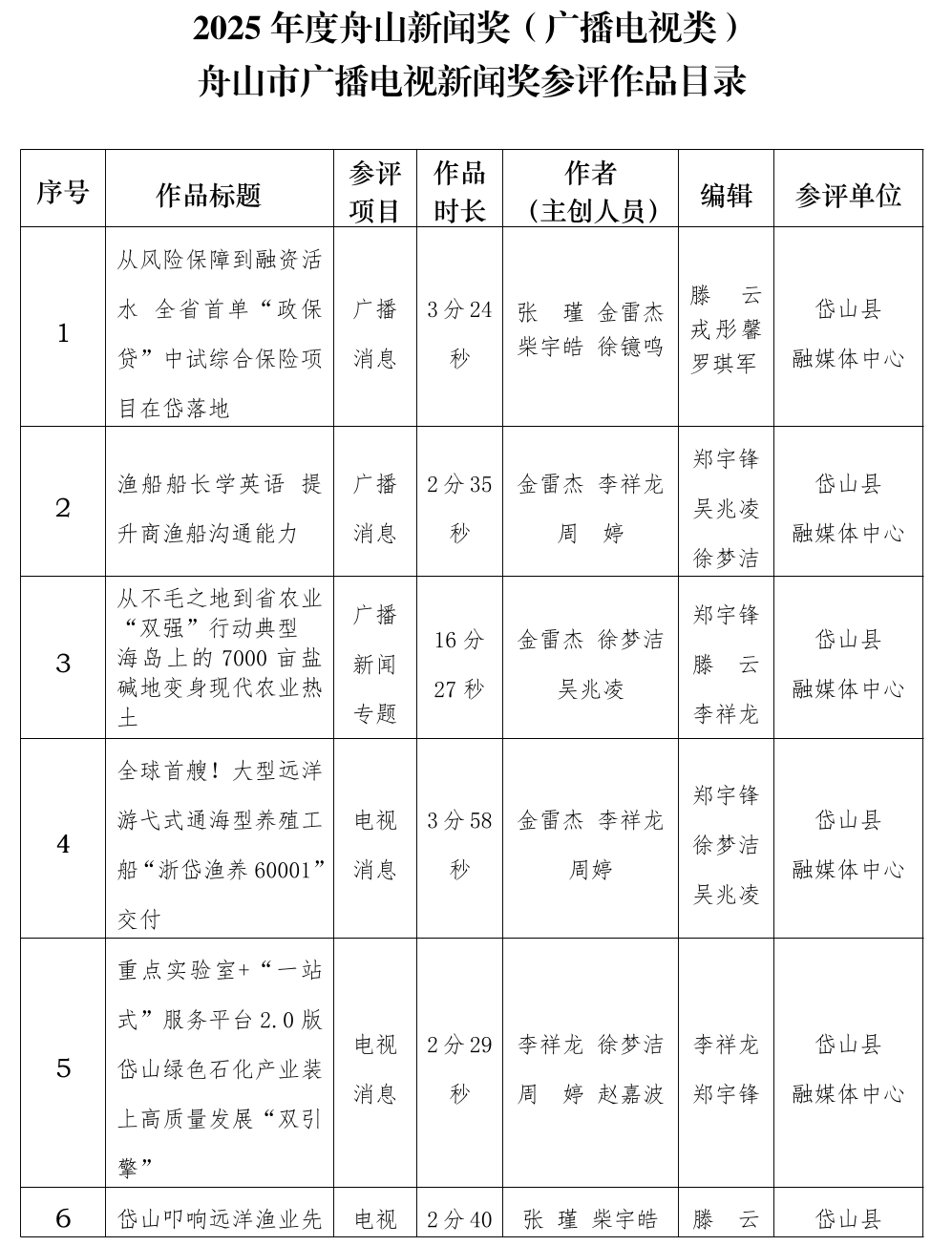 根据《2025年度舟山新闻奖(广播电视部分)和舟山市广播电视新闻奖评选工作的通知》要求,岱山县融媒体中心经民主推荐,选取《从风险保障到融资活水全省首单“政保贷”中试综合保险项目在岱落地》《渔船船长学英语提升商渔船沟通能力》《从不毛之地到省农业“双强”行动典型海岛上的7000亩盐碱地变身现代农业热土》等3件广播类作品,《全球首艘!大型远洋游弋式通海型养殖工船“浙岱渔养60001”交付》《岱山叩响远洋渔业先进装备“智造”之门》《实干奋进·向新前行》等6件电视类作品参加2025年度舟山新闻奖(广播电视部分)和舟山市广播电视新闻奖评选。