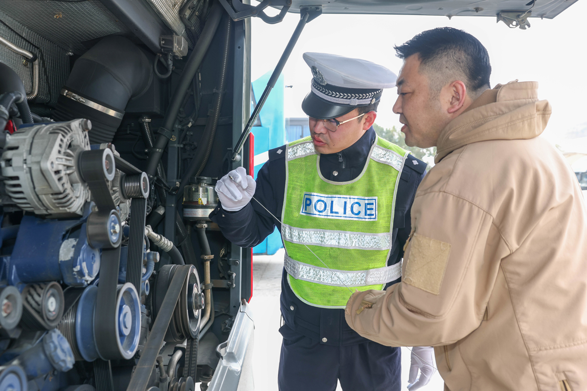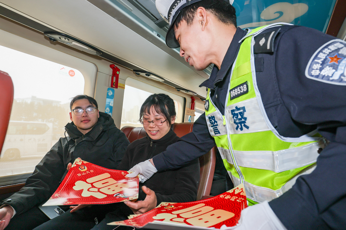 在客运场站,交警向公交司机强调安全驾驶及春运注意事项,登车检查安全手锤、灭火器等设施,确保车辆运营安全,并向驾驶员、候车旅客送上“福”字,祝福大家一路平安、温暖同行。