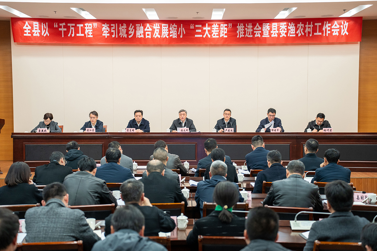 3月27日下午,全县以“千万工程”牵引城乡融合发展缩小“三大差距”推进会暨县委渔农村工作会议召开。市政协副主席、县委书记张文科在会上强调,要深入学习贯彻习近平总书记关于“千万工程”、推动共同富裕的重要论述和考察浙江重要讲话精神,认真落实中央农村工作会议和省市有关会议精神,总结回顾工作情况、查找分析问题短板、研究部署下步工作,持续深化新时代“千万工程”,扎实推动城乡一体融合高质量发展、缩小“三大差距”不断取得新成效。县委副书记、县长卢建波主持会议,李东明、郁曙军、黄江荣参加会议。