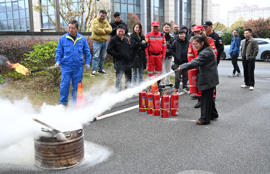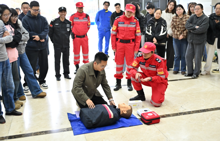 疏散结束后,民安公益救援队利用假人模型现场演示AED除颤仪使用及心肺复苏流程,帮助干部职工掌握急救要领。随后,救援队还讲解了灭火器“提、拔、握、压”的操作要领,并指导干部职工进行实操体验。整个教学环节互动热烈,干部职工踊跃参与。