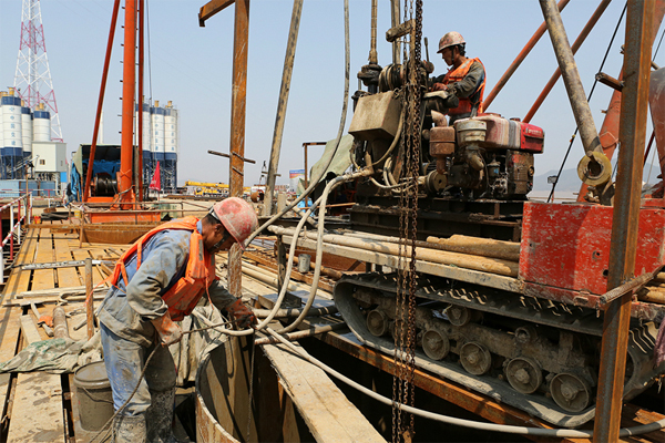 位于秀山侧的引桥端,打桩机的马达声,已轰轰作响,施工人员正抓紧作业。“上月底已经完成23#、24#墩钻孔平台搭设和16#、17#墩等10根钢护筒的沉放工作。”现场一名施工人员介绍说。