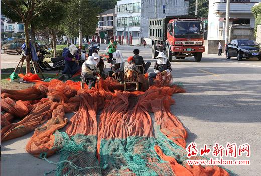 9月25日上午,记者在大蒲门村一路段看到,路边上几名渔嫂正在修补渔网,不时有大卡车经过,真让人为她们捏一把汗。记者提醒,补网作业还需注意人身安全。