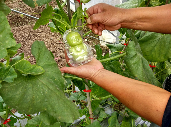 所谓的“人参果”,其实就是甜瓜被套上独特造型模具后生长而成的。瓜胎长,成型率高,卖相好,口感清脆,果之上品。采收后用保鲜膜包裹好,一般情况可以储存一个月。 “人参果创意满足了市民消费者对新奇特的需求。”童永久告诉记者,除了勿忘农人参果之外,试种成功的还有西博洛托等蔬果。