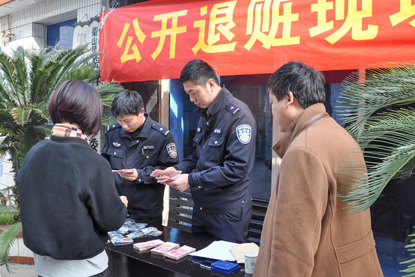 近日,县公安局衢山分局在岛斗社区举行公开退赃会,将破获的系列盗窃案中追缴的4万元现金,40余件珠宝首饰及1部手机逐一退还给受害群众。在退赃会现场,一位市民将写有“公安破案神速、赃物如数归还”的锦旗送到民警手中,以表达感谢之情。