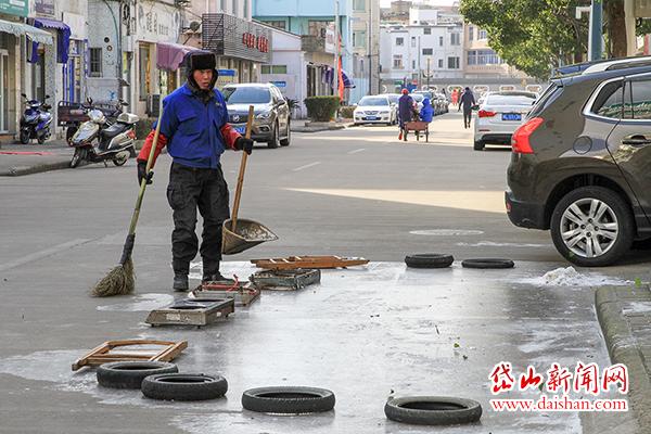 今天早上,面临极严寒天气,环卫工人依旧像往常一样坚守岗位,在安澜路上清扫垃圾,维持路面清洁。