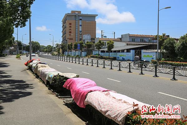 连日来天气晴好,非常适合洗晒,然而在高亭沿港西路,有人却把大量衣物被子直接晾晒在道路绿化带上,道路上车来车往,如此晒被不仅不卫生,更是严重影响了市容市貌。
