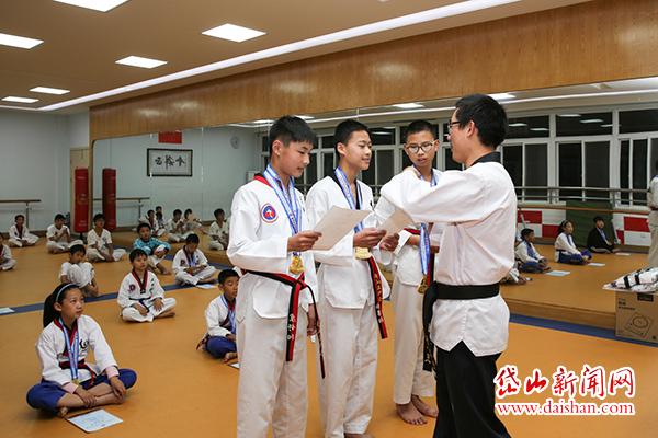 近日,在“2016年中国普陀国际武术比赛”中,由县青少年宫组建的跆拳道队,参加3个项目比赛,最终取得团体全国排名第七、舟山第一的可喜成绩。图为在县青少年宫跆拳道训练场,教练正在为获奖的13名选手进行赛后颁奖。